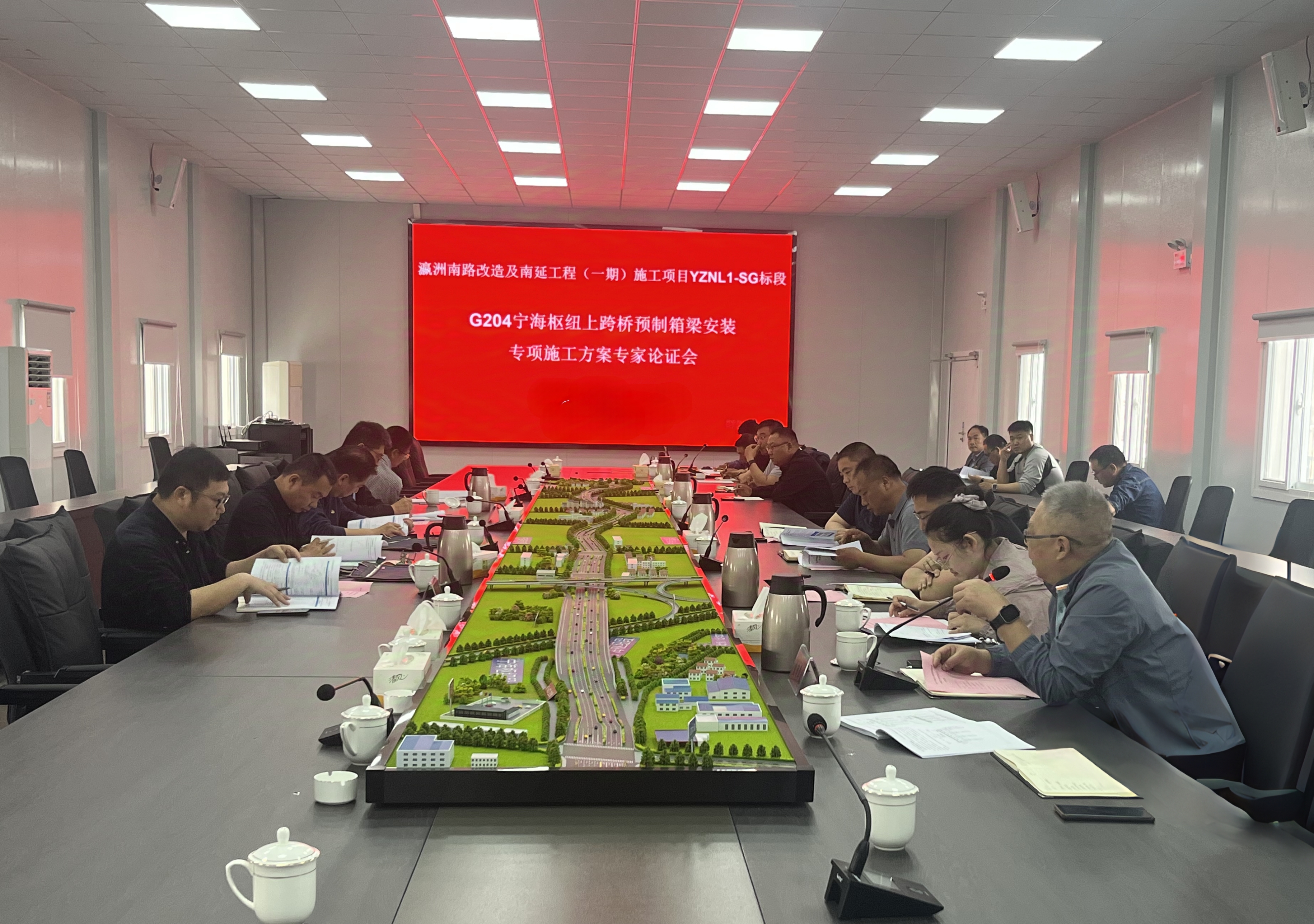 寧海樞紐上跨橋是瀛洲南路南延工程的重要控制性工程,其預(yù)制箱梁的運(yùn)輸與安裝涉及高空作業(yè)、大件運(yùn)輸、重型吊裝等高危環(huán)節(jié),施工難度大、安全風(fēng)險高。會上,施工單位詳細(xì)匯報預(yù)制箱梁運(yùn)輸路線規(guī)劃、吊裝設(shè)備選型、安裝工藝及應(yīng)急預(yù)案等內(nèi)容。與會專家結(jié)合工程實際,對方案展開深入研討,一致認(rèn)為方案內(nèi)容基本齊全、總體可行,并提出針對性優(yōu)化意見:一是進(jìn)一步完善施工技術(shù)標(biāo)準(zhǔn)及質(zhì)量保障措施,確保箱梁安裝精度;二是細(xì)化運(yùn)輸過程中的交通組織、限高限載管控及動態(tài)監(jiān)測方案;三是嚴(yán)格復(fù)核吊裝地基承載力計算及起重設(shè)備選型驗算數(shù)據(jù),強(qiáng)化過程監(jiān)管;四是優(yōu)化應(yīng)急預(yù)案,提升突發(fā)天氣、設(shè)備故障等場景的響應(yīng)處置能力。