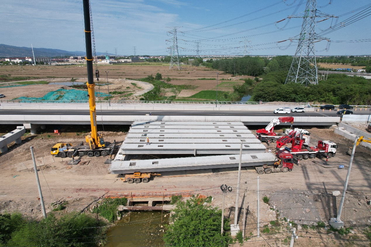 近日,瀛洲南路改造及南延工程(一期)寧海樞紐上跨橋完成高壓線下限高箱梁吊裝作業(yè)。