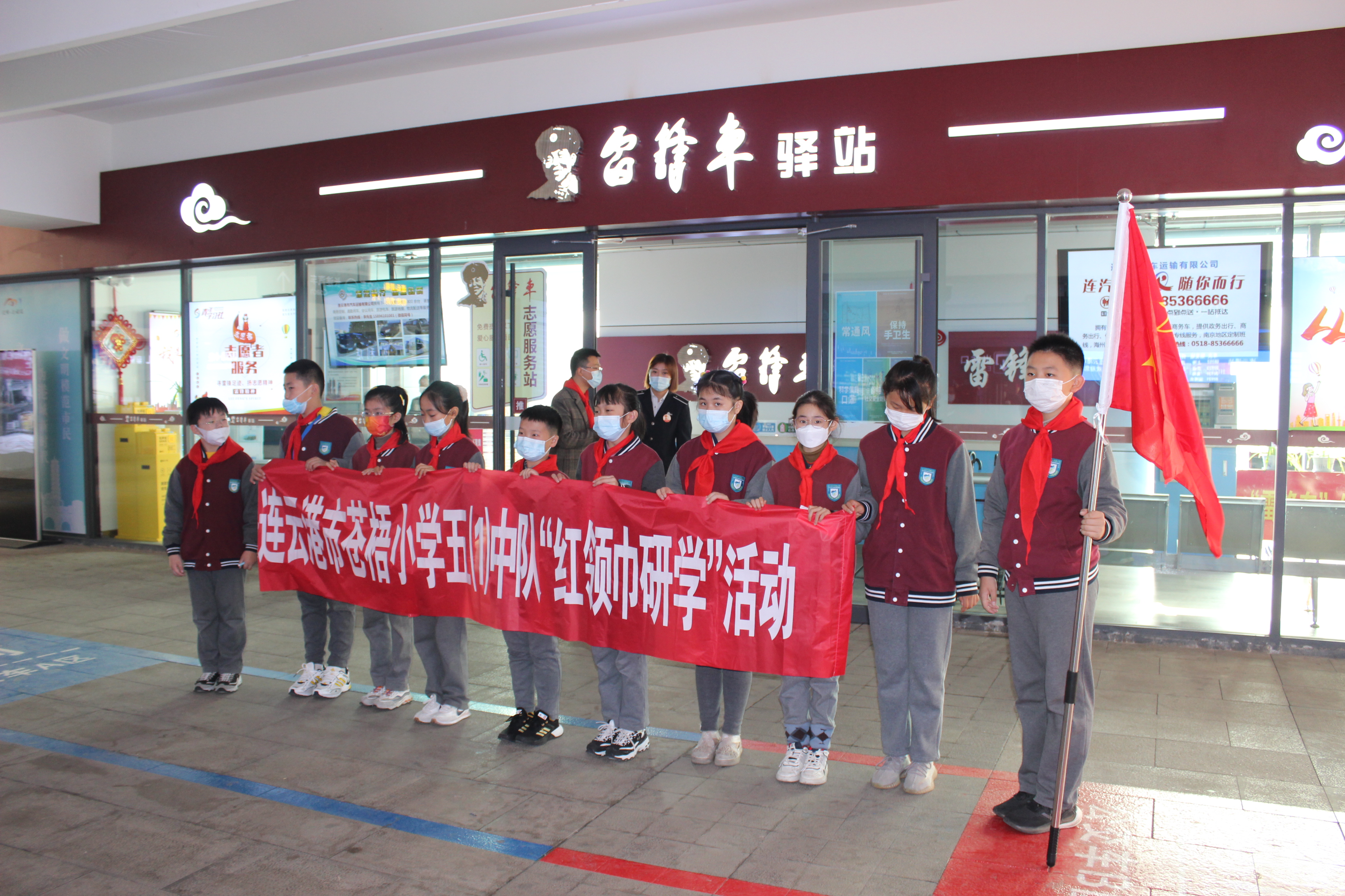 最后,同學(xué)們?cè)隗A站門(mén)前拉起《連云港市蒼梧小學(xué)五(1)中隊(duì)“紅領(lǐng)巾研學(xué)”活動(dòng)》橫幅,拍照留念。