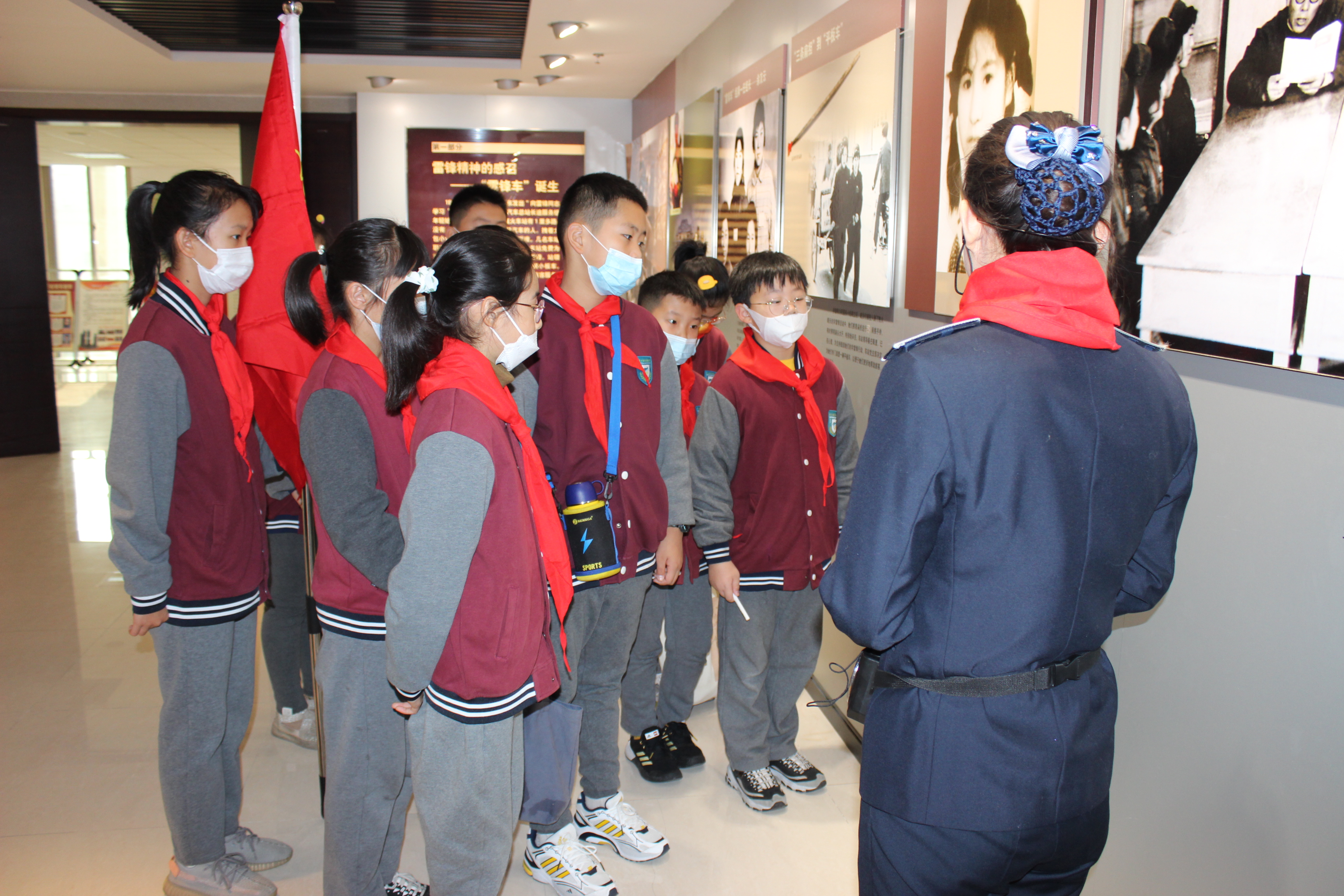 同學(xué)們跟隨著少先隊(duì)隊(duì)旗,走進(jìn)“雷鋒車(chē)”事跡陳列館,為講解員李園園佩戴紅領(lǐng)巾。他們跟隨講解員的腳步,認(rèn)真聆聽(tīng)雷鋒車(chē)手的感人事跡,觀看圖片、歷史實(shí)物,了解雷鋒車(chē)的更迭發(fā)展。當(dāng)講解員說(shuō)到起初“雷鋒車(chē)”手們使用的平板車(chē)時(shí),同學(xué)們格外好奇,他們中的大部分從未見(jiàn)過(guò)平板車(chē),紛紛湊到車(chē)前撫摸觀察,感嘆雷鋒車(chē)手的艱辛,喊起了“向‘雷鋒車(chē)’手阿姨學(xué)習(xí)”的響亮口號(hào)。